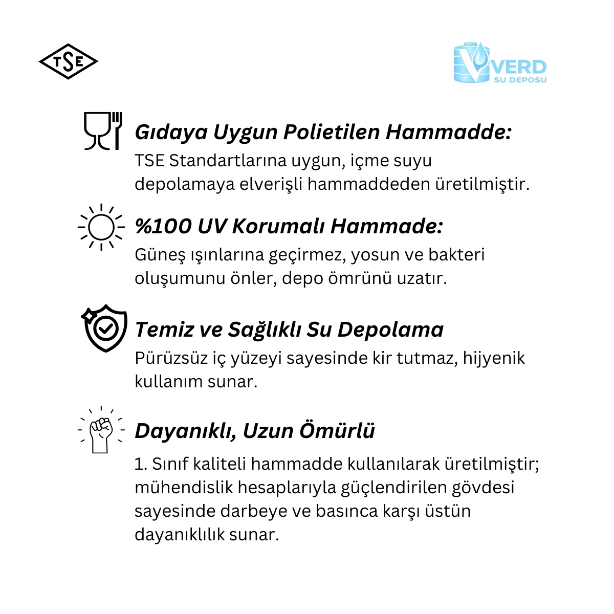 Su deposunun yapıldığı malzemenin kalitesi, deponun dayanıklılığı ve suyunuzun temizliği açısından büyük önem taşır. Gıda tüzüğüne uygun, UV ışınlarına dayanıklı ve sağlam bir plastik malzeme tercih etmelisiniz.